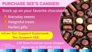 Find the Perfect Tallit for Your Simcha! TAE Sisterhood has a beautiful selection of tallitot just for you! The perfect gift for your child’s or grandchild’s b’nei mitzvah. Call Paula Kraft to schedule an appointment at (805) 341-7665.